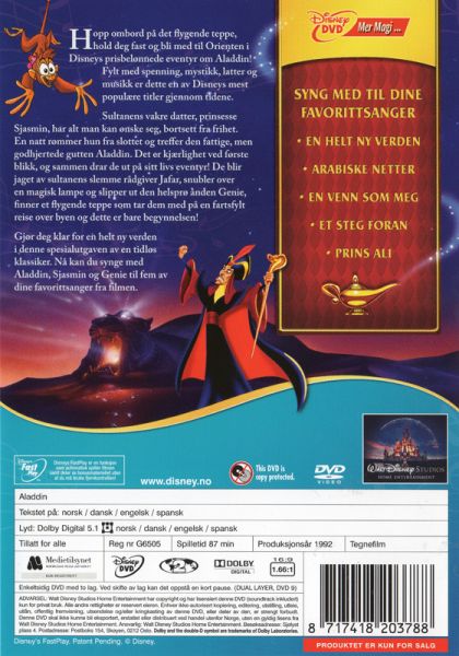 A poor boy in the ancient middle east name Aladdin and his pet monkey, Abu, stumble across a cave with hidden treasure. The most precious of them all is a lamp with a genie in it. After rescuing the genie, Aladdin is granted his wishes as well as the comradery of the genie. The local sultan is looking for a proper sutor for Princess Jasmin and the genie helps Aladdin climb the ranks to win Jasmins' hand. The love story is distraught as Jafar fights to take Aladdins place with Jasmin.