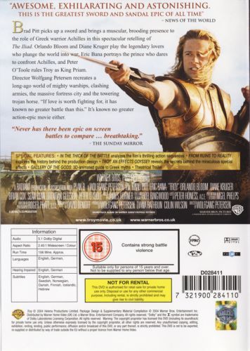 The movie "Troy" chronicles the classic story The Iliad by Homer. It is a modern day representation of the same tale. Helen, who is the wife of a Greek, falls in love with a Trojan prince. The prince, Paris, takes her back to Troy, which is an enemy of Greece. After Helen does not return to Greece, she becomes "Helen of Troy." This romance sparks a war between the two city-states. There are many battle scenes depicting the war between the two states. Achilles, portrayed by Brad Pitt, sides with the Greeks. He is a half-god and is nearly unbeatable in combat, accept for his heel. His arch-enemy in the story is Hector, the brother of Paris and also a very skilled warrior. The story of the Trojan horse is also included. The Greeks smuggle themselves into a giant wooden horse in order to infiltrate the walls of Troy. It is through this method that the warriors of Greece manage to defeat the Trojans.