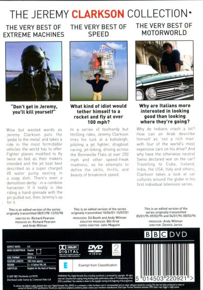 Includes Three Classic Clarkson Series. Fasten your seatbelts as you watch this high speed, heart-stopping collection of some of the most powerful and unusual machines ever built – all test-driven by the definitive car expert, Jeremy Clarkson. Available for the first time on DVD, this trio examines the art, science and psychology behind the machines and the people. Includes Extreme Machines, Motorworld and Speed