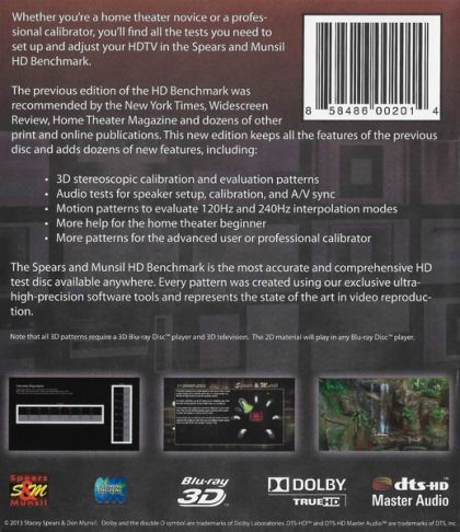 Help your TV look its best If you have an HDTV and a Blu-ray player, the Spears & Munsil HD Benchmark calibration disc can help you make sure you're getting the best-looking picture possible. Whether you're a home theater novice or a seasoned veteran, you'll find all the tests you need to correctly set up and adjust your TV and Blu-ray player. We were big fans of the previous version of this disc, and the new edition keeps all the features of that disc and adds new capabilities that reflect the latest TV technologies. The first Spears & Munsil disc was the go-to choice for many reviewers and other video experts, and this new one is a worthy successor. The test patterns on the HD Benchmark are all designed by Spears and Munsil. Rather than using the standard patterns found on other calibration discs, they have designed their own patterns that are easier to use. This is the most complete calibration disc we've seen, with advanced features like 3D patterns and motion patterns to evaluate 120Hz and 240Hz performance on LCD TVs. Other calibration discs we've tried have tended to be either too basic, or so complicated that you needed to be a video engineer to use them. With the HD Benchmark, you can make as few or as many adjustments as you want. Each test is clearly explained, with examples of correct and incorrect settings, so you know what you're doing and why. A basic calibration usually takes 30 minutes or less. There are even some audio tests for speaker setup and calibration. Product Highlights: includes all the features of the first edition disc and adds dozens more calibration patterns for all major TV picture controls setup and evaluation patterns for optimizing your TV's and Blu-ray player's settings 3D stereoscopic calibration and evaluation patterns motion patterns to evaluate 120Hz and 240Hz interpolation modes audio tests for speaker setup, calibration and A/V sync all 3D patterns require a 3D Blu-ray player and 3D TV; the 2D material will play in any Blu-ray player warranty: 60 days