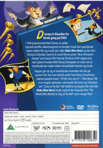 In the tradition of Fantasia, Make Mine Music is a glorious collection of musically charged animated shorts featuring such fun-filled favorites as "Peter and the Wolf", narrated by the beloved voice behind Winnie the Pooh. In addition you'll enjoy such classic cartoon hits as "Casey at the Bat," "The Whale Who Wanted to Sing at the Met" and "Johnnie Fedora and Alice Bluebonnet."