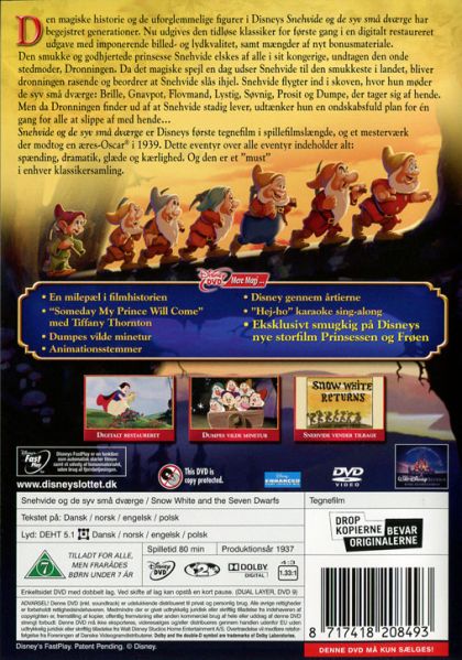The first, and by far most memorable full-length animated feature from the Disney Studios, "Snow White and the Seven Dwarfs" may have been superseded technically by many of the films that followed it. But its simple story of a charming little princess saved from the evil deeds of her wicked step-mother, the queen, by a group of seven adorable dwarfs made history when it was first released in December, 1937 and has since become an incomparable screen classic.