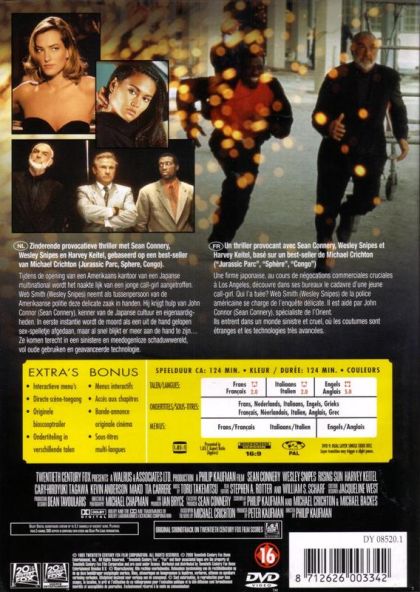 During a party at a Japanese corporation, an American woman is found dead. Police detective Lt. Webster Smith (Wesley Snipes) is assigned the investigation, but on the way there he gets a call instructing him to pick up former Capt. John Connor (Sean Connery), an expert on Japanese Affairs. Arriving at the scene, Webster concludes that the evidence points to murder. Connor, however, thinks there is a lot more going on. As the investigation continues, there is indeed a lot more to it.