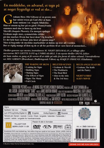 A first rate alien invasion/thriller movie from writer/director M. Night Shyamalan and starring Mel Gibson and Joaquin Phoenix. A former preacher Graham Hess (Gibson) is living in the rural Pennsylvania countryside as a farmer when he starts to experience strange phenomenon after a crop circle is discovered on his farm by his children. Along with his brother Merrill (Phoenix) and his children they begin to realize that an alien force may be preparing to invade the planet. Things may not be as they seem though in a classic Shyamalan twist of an ending after the aliens have invaded. The final question is do you believe in 'Signs'?