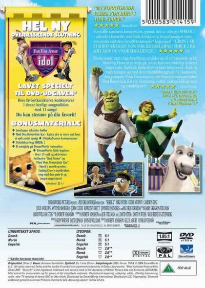Shrek, Fiona, and Donkey go the Kindom of Far Far Away to meet Fiona’s parents. They disapprove of Shrek. The King had already promised Fiona to the Fairy Godmother’s son, Prince Charming. He plots for Puss in Boots to kill Shrek. Shrek and Donkey meet Puss and become friends. They break into the Fairy Godmother’s factory to find a potion. Shrek and Donkey both take the potion, making them, and Fiona, beautiful. They will only remain beautiful if Fiona and Shrek kiss before midnight. Prince Charming hears about this and makes a plan. He pretends to be the handsome Shrek. That night, there is a party at the castle. Finally Shrek makes it to the party and explains everything. They all live happily ever after, except for Charming and Fairy Godmother, that is.