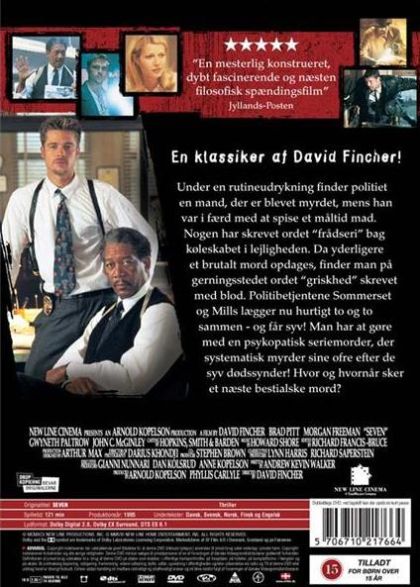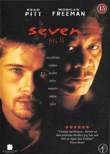 A morbidly obese man is found dead of internal hemorrhages after being force-fed copious amounts of food, and soon police realize that a twisted serial killer is at work. Se7en follows two police detectives as they investigate a series of murders that seem to be inspired by the the seven deadly sins. Jaded and experienced Detective Somerset (Morgan Freeman) is nearing retirement and has been partnered with the young, idealistic and brash Detective Mills (Brad Pitt) for this case. As they follow the unnerving and frightening trail of this strange serial killer, the two detectives must confront the urban decay and apathy of a bleak city and each other over their differences in philosophy and policing style.