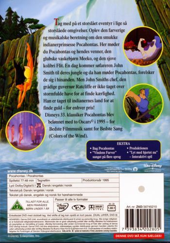 In Disney's take on this tale from early American history, Pocahontas (Irene Bedard) is a young girl bristling under the strong hand of her father. She loves nature and is friends with the animals and is determined not to be the bride of the warior that her father said she will marry. She meets John Smith (Mel Gibson) and continues to see him even though her father has stated she must not go near the invaders. The "savages" as the English Govenor Ratcliff (David Ogden Stiers) sees them must be hiding the gold he is convinced is there in the new land. John Smith and Pocahontas must do all they can to stop a war between the settlers and the indians. The story shows an interesting view of how cultures with no understanding see each other so poorly at first, but can learn to accept with time and an open heart.