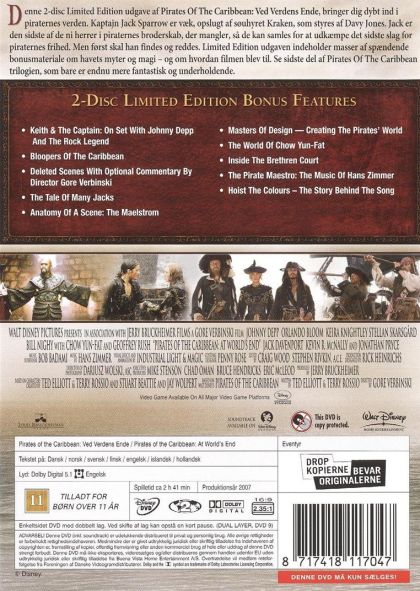 The Pirates are back for their third adventure. Will Turner (Orlando Bloom) and Elizabeth Swann (Keira Knightley) have joined forces with Captain Barbosa (Geoffrey Rush), who has been brought back from the dead to help them rescue Jack Sparrow (Johnny Depp) from Davy Jones' locker. Along the way they will discover that the only way to defeat Davy Jones (Bill Nighy) and his Flying Dutchman is to stab his heart, and replace it with your own, for they say that the Flying Dutchman must always have a captain. First they must retrieve the navigational chart to World's End from Sao Feng (Chow Yun-fat) the Singapore pirate lord. Then when they rescue Jack they must find a way to defeat Davy Jones and restore order to the seas.