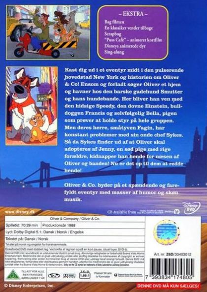 Oliver (Joey Lawrence), a cat, is alone on the streets. He attempts to steal some food but fails until Dodger (Billy Joel), a dog, shows up and helps but keeps the food himself and runs off. Oliver follows him to the docks where he lives with other dogs and a poor man named Fagan (Dom DeLuise). Fagan owes Sykes (Robert Loggia) money, and Sykes comes to tell Fagan to pay up. Oliver helps the dogs fight off Sykes' dogs and becomes their friend. The next day, the dogs see a limo and decide to steal a part of it for Fagan. They fail, but Oliver gets stuck inside and gets found by a girl named Jenny (Natalie Gregory) who keeps him. Oliver is happy but the dogs don't know it and get him back. Fagan returns and learns that Oliver is owned by rich people and tries to ransom him, so Jenny comes to pay, but when Fagan sees her he feels guilty and gives Oliver back. Then, Sykes comes and kidnaps Jenny to hold her for ransom. Fagan and the dogs fight to get her back and win, and then the next day everyone goes to Jenny's party.