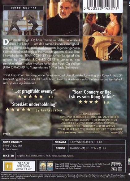 The movie "First Night" features Richard Gere as Sir Lancelot in a classic re-telling of the story of King Arthur and his Round Table of Knights, with a special emphasis on the possible love affair between Arthur's queen Gwenovere and Arthur's best knight, Lancelot. Arthur entrusts his best friend to bring his bride to the court from her father's house, but he does not forsee that a romance may develop between the two. Lancelot must decide whether his love for the Queen is worth the damage it may do to both his brotherly relationship with Arthur and the nation of England as a whole. Plus, the wizard Merlin is always there with a watchful eye, looking to interfere! Eventually, Arthur is tempted to have an affair of his own, and the son spawned from that union may be the individual to bring ruin upon his entire nation. Soon, King Arthur is fighting not just for his Queen and his family, but for the entire future of his kingdom, and his best friend Lancelot may not be able to fight beside him.