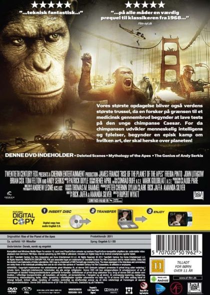 Scientist Will Rodman is determined to find a cure for Alzheimer's, the disease which has slowly consumed his father Charles. Will feels certain he is close to a breakthrough and tests his latest serum on chimpanzees, noticing dramatic increases in intelligence and brain activity in the primate subjects. A baby called Caesar, born to one of the test chimps, is scheduled to be destroyed so Will smuggles the animal home where he raises the infant as his own, little knowing that the onset of a war for supremacy has begun...
