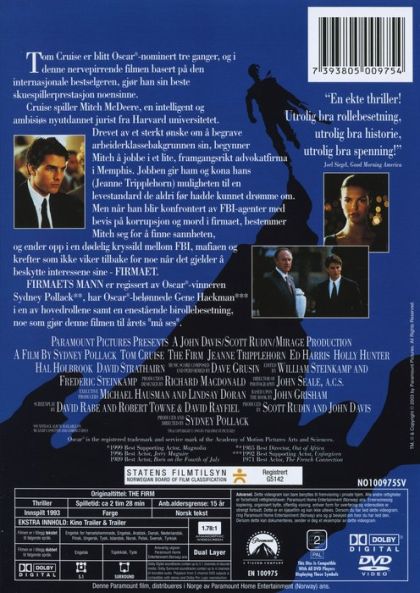 Mitch McDeere is a young man with a promising future in Law. About to sit his Bar exam, he is approached by 'The Firm' and made an offer he doesn't refuse. Seduced by the money and gifts showered on him, he is totally oblivious to the more sinister side of his company. Then, two Associates are murdered. The FBI contact him, asking him for information and suddenly his life is ruined. He has a choice - work with the FBI, or stay with the Firm. Either way he will lose his life as he knows it. Mitch figures the only way out is to follow his own plan...