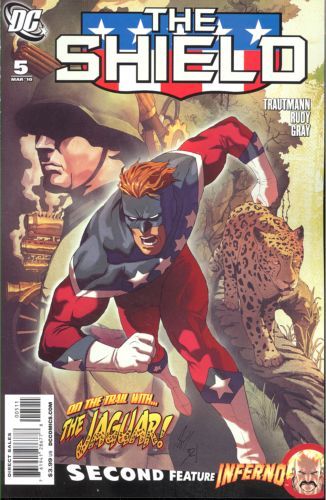 Written by Eric Trautmann; co-feature written by Brandon Jerwa Art by Marco Rudy & Mick Gray; co-feature art by Greg Scott Cover by Sami Basri The Shield continues his search through the Brazilian jungles for the Nazi tech he encountered with the Great Ten. But another hero is on the hunt - the Jaguar! Plus, Inferno is about to confront the mysterious man behind the attacks on Frank Verrano, but he'll have to go through the Comet! On sale January 13 o 40 pg, FC, $3.99 US