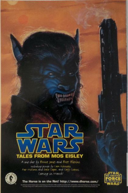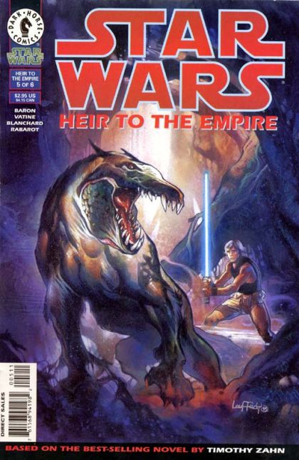 Written by Mike Baron. Art by Olivier Vatine and Fred Blanchard. Cover by Mathieu Lauffray. Mara Jade has survived for most of her life among the worst riffraff in the galaxy. Years ago, she posed as a dancer in the decadent court of the late Jabba the Hutt. It was there that she first witnessed Luke's awesome powers of Jedi mind-control. Now, in the steaming jungles of Myrkr, Luke and Artoo are Jade's helpless captives. Jade is determined to finish off her Jedi prisoner -- once she's finished stripping him of his Jedi secrets! Cover price $2.95.