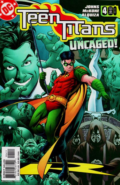 Impulse receives surgery; doctors can't use anesthetic because he metabolizes it too quickly. Starfire discovers that Superboy, Wonder Girl and Robin have left the tower. Robed cultists pursue and capture a woman in a forest. And is there a ghost in the library? No... just Impulse reading at super-speed, and apparently retaining everything he reads. Deathstroke (really Jericho) gets into a fight with Robin, who holds his own, for a little while. Finally, Jericho/Deathstroke is about to shoot Robin in the head when someone disassembles his weapon at super-speed. But Bart Allen is no longer Impulse. He has reinvented himself as the new Kid Flash.