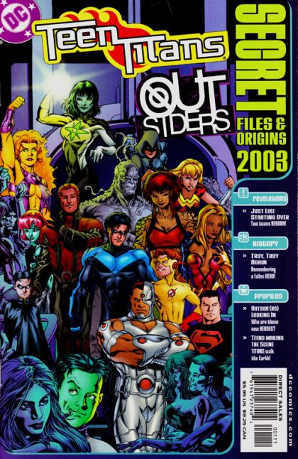 WRITTEN BY GEOFF JOHNS, JUDD WINICK, PHIL JIMENEZ, AND VARIOUS; ART BY IVAN REIS, CARLO BARBERI, JIMENEZ, AND VARIOUS; COVER BY TOM RANEY, MIKE MCKONE, SCOTT HANNA & LARY STUCKER. An explosive one-shot devoted to DC's hot new super-teams! TEEN TITANS writer Geoff Johns and OUTSIDERS writer Judd Winick join Ivan Reis, Carlo Barberi, Marc Campos & Norm Rapmund for the extra-sized story "A Day After," revealing secrets of both groups, with hints at the terrible threats they'll face in the months to come! Plus, Donna Troy's friends and loved ones remember their fallen friend in the 8-page "Who Was Donna Troy?", a story written and pencilled by Phil Jimenez and inked by Andy Lanning, and pin-ups of familiar and new characters from both teams' titles by an array of incredible artists. And don't miss the pencilling debut of Geoff Johns! Profile pages (mostly written by Johns & Winick): Robin by Rick Mays & Aaron Sowd, Nightwing, Jade & Arsenal (2 pages) by Mike McKone & Lary Stucker, Indigo by Ale Garza & Stucker, Wonder Girl by Will Conrad & Nelson, Thunder by Jason Pearson, Cyborg by Karl Kerschl, Starfire by Michael Turner, Kid Flash by Geoff Johns & Nelson (with text by Jeremy Johns), Grace by Judd Winick (with text by Mike McAvennie), Metamorpho by Tom Raney & Scott Hanna, Beast Boy by Carlo Barberi & Marlo Alquiza, Deathstroke the Terminator by Kilian Plunkett, Superboy by Jim Mahfood, Raven by Pascual Ferry. FC, 64 PG. $5.95 Cover price $5.95.