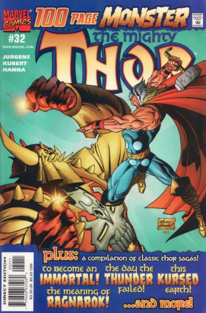 100-page Giant! "Forever Kursed!" Part 2 of 2. Story by Dan Jurgens. Art by Andy Kubert, Scott Hanna, and Jesse Delperdang. The Dark Elf, Malekith, has unleashed the icing death of the Casket of Ancient Winters on Asgard and only the God of Thunder can stop him. But first he'll have to get past the indomitable Kurse, a foe whose strength rivals his own. Plus, "To Become an Immortal!" A tale originally presented in Thor (1st Series) #136. Story by Stan Lee. Art by Jack Kirby and Vince Colletta. Thor has brought his beloved before the All-Father so that they may be wed. However, Odin will not see the Prince of Asgard married to a mere mortal. So what does the Omnipotent One do? He turns Jane Foster into an immortal! "The Day the Thunder Failed!" Story by Roy Thomas. Art by John Buscema and Tom Palmer. An epic tale from Thor and Loki's past. "The Kursed Earth...!" Guest-starring Power Pack. Story and art by Walter Simonson. Originally presented in Thor (1st Series ) #. A Secret Wars II tie-in that features the Beyonder resurrecting Kurse and doubling his already considerable strength before sending the behemoth after the Odinson. And finally, The Tales of Asgard backup features "The Meaning of Ragnarok!" and "Aftermath!" Originally presented in Thor (1962-1996 1st Series) #127-128. By Stan Lee and Jack Kirby. Cover price $3.50.