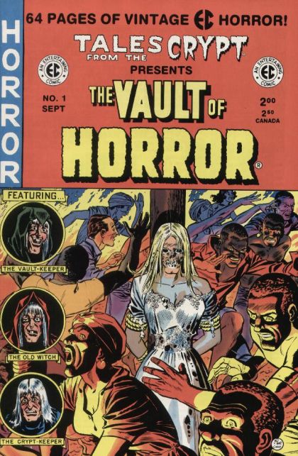 Reprints. 1991-92 Russ Cochran reprint series. This series can easily be confused with the original series (10c cover priced), the 1990-91 Gladstone reprint series, or 1992-99 RC/Gemstone reprint series. Cover art by Johnny Craig. "Til Death," script and art by Johnny Craig; Steve's new wife falls ill, dies and is buried; Steve's servant, Jebco, tries to fill the void, but the despair is too great. "The Chips Are Down!", script by Al Feldstein, art by Jack Kamen; Sigmund was buzzed on his intercom that Colonel Turner was there to see him and his two partners, Henning and Field; The Colonel was there to tell them that their sawmill had been chosen for a highly secret government contract to produce thin wooden discs, at a rate of 60,000 per month. "The Defiler" text story, art by Marie Severin. "For How the Bell Tolls!", script by Al Feldstein, art by George Evans; Long ago, in a far-away land, there was a castle which had a belfry and a large bell hanging in it; Every time there was a special occasion, the royal bell ringer plied his trade, watched for over 34 years by his apprentice, but never given the chance to ring the bell once in all that time! "We Ain't Got No Body!", script by Bill Gaines (co-plot) and Albert B. Feldstein (co-plot, script), art by Graham Ingels (as Ghastly); The rotting corpse of Henry Bodwin confronts his brother Norton, and reminds him about when his two buddies and he conspired to kill him over the will in which Henry had made Norton his beneficiary: for $20,000 with double indemnity. "Mars is Heaven!", script by Ray Bradbury (original story) and Al Feldstein (adaptation), art by Wally Wood; Sneaky Martians disguise themselves as the dead loved ones of astronauts in order to slay them in their sleep. "Snap Ending!", script by Al Feldstein, art by Al Williamson and Roy Krenkel; Rocketship #269 is approaching a gigantic planet with a density 50 times that of the Earth, and decide to circle it to take a closer look; They spot and decide to land on a satellite moon of the planet. "Fever" text story. "The Parallel!", script by Bill Gaines (co-plot) and Al Feldstein (co-plot and script), art by Jack Kamen; Feeling that he had already lived the exact moment before, Calvin tells his wife that he believes that there exists a parallel world which duplicates exactly everything happening at the current time. "Disassembled!", script by Al Feldstein, art by Joe Orlando. 68 pgs., full color. Cover price $2.00.