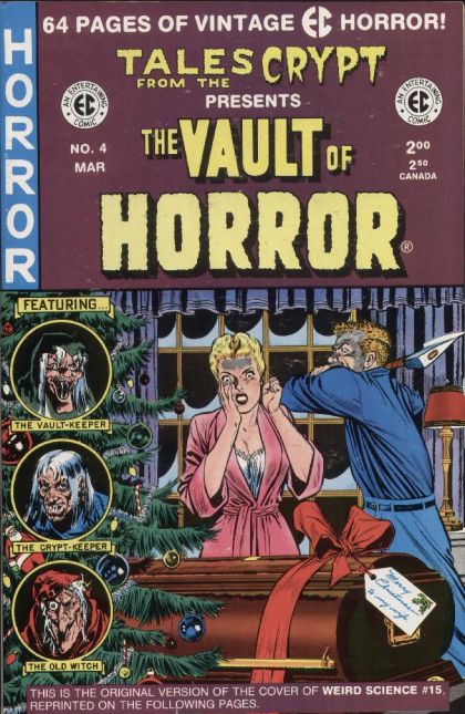Reprints. 1991-92 Russ Cochran reprint series. This series can easily be confused with the original series (10c cover priced), the 1990-91 Gladstone reprint series, or 1992-99 RC/Gemstone reprint series. Cover art by Johnny Craig. Joe Orlando bio with photo. "And All Through the House," script and art by Johnny Craig; Poor Joseph has just been murdered by his wife on Christmas Eve; When their daughter, Carol, hears the commotion, she thinks it's Santa Claus arriving. "Tombs-Day!", art by Jack Davis; Professor Burton is leading an expedition to an Egyptian archaeological dig in search of a vanished earlier group; They locate an ancient tomb and enter, only to have a panel close behind them, trapping them inside. "Space to Breathe!" text story. "Beauty Rest," art by Jack Kamen; The local undertaker's convention is holding a "Miss Corpse" beauty pageant, and Helen discovers that her roommate Joyce has managed to fix the contest in her own favor; A jealous Helen gives Joyce sleeping pills and takes her place at the pageant. "Shoe-Button Eyes!", script by Johnny Craig, art by Graham Ingels; Billy was born blind, but his mom takes good care of him; Eventually, Billy's Mom marries Jed, a nasty, abusive brute. Weird Science #15 cover reprint by Wally Wood. "The Martians!", script by Al Feldstein, art by Wally Wood; The first manned mission to Mars is a success!; The crew disembarks and soon finds signs of intelligent life; They enter what appears to be a museum and chance upon an exhibit depicting a conflict between a blob monster and a human being. "Captivity," script by Al Feldstein, art by Al Williamson; Lou and Hank are in Arizona, searching for uranium deposits; However, the radioactivity combines with a mechanical malfunction to hurl them both into Earth's primordial past, complete with dinosaurs. "Cunning!" text story. "Miscalculation!", script by Al Feldstein, art by Jack Kamen; Melvin receives an unexpected package in the mail; It turns out it was actually meant for someone else, who lives 1000 years in the future! "Bum Steer!", script by Al Feldstein, art by Joe Orlando; Several men are abducted by an alien that resembles a centaur with the head of a skeletal horse; The alien assures them they won't be harmed, and that they are invited to the alien home planet. 68 pgs., full color. Cover price $2.00.
