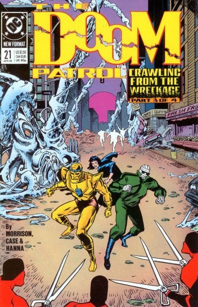 'Crawling From the Wreckage,' part 3 of 4. The Scissormen come a-calling as the Patrol sets up shop in the old Justice League of America's former mountain headquarters. Written by Grant Morrison, with art by Richard Case and Scott Hanna. Cover by Case. New Format. Cover price $1.50.
