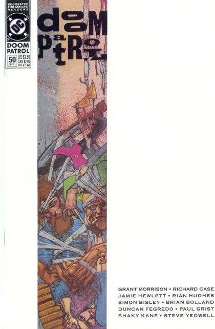 Fifty issues...sounds like time for a face-off between the Doom Patrol and their very worst enemies, the chilling new Brotherhood of Dada, in a story written by Grant Morrison, with art by Richard Case, Jamie Hewlett and Rian Hughes. A special portfolio section contains pin-ups by Case, Hewlett, Hughes, Simon Bisley, Brian Bolland, Duncan Fegredo, Shaky Kane, Paul Grist and Steve Yeowell. Painted cover by Bisley. Suggested for Mature Readers. New Format. Cover price $2.50.