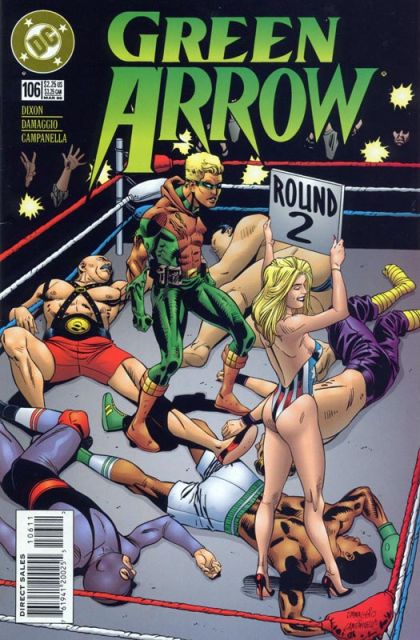 Cover pencils by Rodolfo Demaggio, inks by Robert Campanella. Enter the Roustabout starring Green Arrow [Connor Hawke], Oliver Queen [Green Arrow] (flashback), Ali Ben Khadir, "Elvis, and "Bruce Lee", script by Chuck Dixon, pencils by Rodolfo Damaggio, inks by Robert Campanella; Connor enters a roughneck contest in Vegas in his continuing pursuit of money to save the monastery. 36 pgs. $2.25. Cover price $2.25.