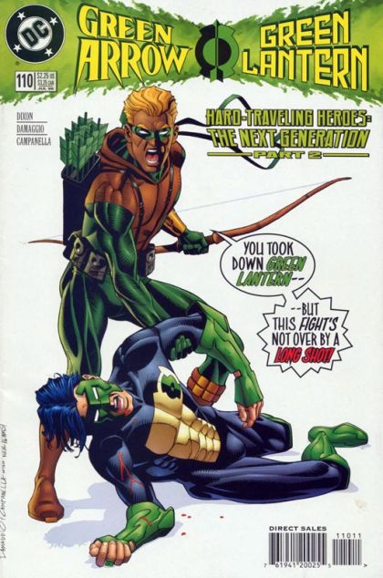 Green Lantern/Green Arrow crossover, Next Generation, Pt. 2 of 4. Cover pencils by Rodolfo Demaggio, inks by Robert Campanella. Desolation Again starring Green Arrow [Connor Hawke], Green Lantern [Kyle Rayner], The Judge of Desolation, and Hatchet, script by Chuck Dixon, pencils by Rodolfo Damaggio, inks by Robert Campanella; Green Arrow and Green Lantern are "Hard-Traveling" heroes, just like their namesakes, as they go on a quest for Kyle's Dad. 36 pgs. $2.25. Cover price $2.25.