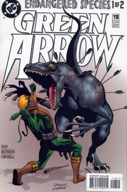 Cover pencils by Rodolfo Demaggio, inks by Robert Campanella. Dragon Country starring Green Arrow [Connor Hawke], Eddie Fyers, Warlord [Travis Morgan] (cameo), Big Zihn, Master Jansen (flashback), and Generalissimo, script by Chuck Dixon, pencils by Dougie Braithwaite, inks by Robert Campanella; Connor and Eddie enter the Golden Triangle after Connor receives a photograph of someone that looks like Oliver Queen. 36 pgs. $2.25. Cover price $2.25.