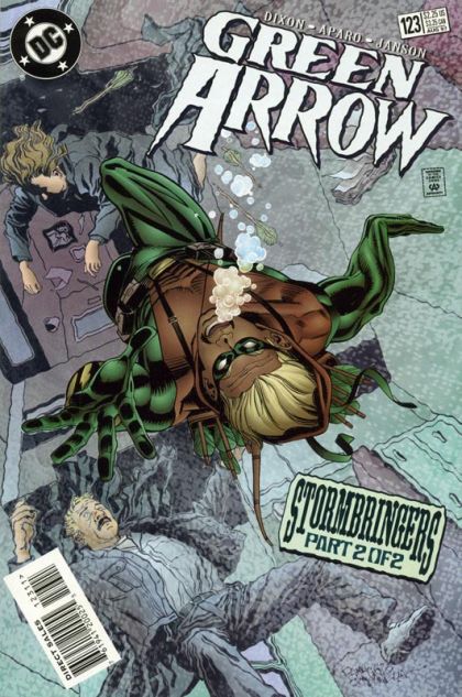 Stormbringers, Part 2 of 2. Green Arrow, Master Jansen and Officer Charro must take down McCloud, the rainmaker. And it's not just their lives, but those of Connor's grandfather and an entire town that hang in the balance. Written by Chuck Dixon, with art by Jim Aparo and Klaus Janson. Cover by Rodolfo Damaggio and Robert Campanella. Mando Format. Cover price $2.25.