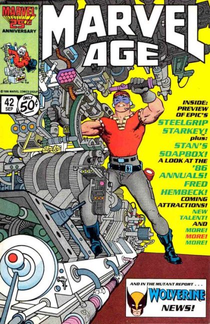 'It's Genetic' strip by Kyle Baker; Steelgrip Starkey and the All-Purpose Power Tool - The Making of a Modern Myth, with comments from Alan Weiss; 2-page Fred Hembeck strip; An Annual Tradition - a look at the 1986 Marvel Annuals; Star Spotlight: Hugga Bunch; The Marvel Age: 1972 (Part II); New Talent Department - Jim Shooter comments on Jim Sanders III's sample inks. Steelgrip Starkey cover by Alan Weiss & Jim Sherman. Cover price $0.50.