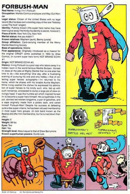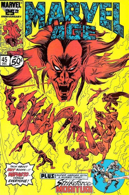 Announcing the Official Marvel Index to the X-Men, with comments from Mike Higgins; The Attention, the Acclaim, the Ultimate Self-Sacrifice - Strikeforce: Morituri, with comments from Peter B. Gillis and Brent Anderson; Star Spotlight: Defenders of the Earth; 2-page Fred Hembeck strip; a look at the Mephisto limited series, with comments from Al Milgrom, Ralph Macchio and John Buscema; Star Spotlight: Inhumanoids; a look at the graphic novel Dracula: A Symphony in Moonlight and Nightmares, with comments from Jon J Muth; Star Spotlight: Popples; The Marvel Age: 1973 (Part I). Mephisto cover by John Buscema & Tom Palmer. Forbush-Man back cover art by Ron Zalme and Wendy Pini. Cover price $0.50