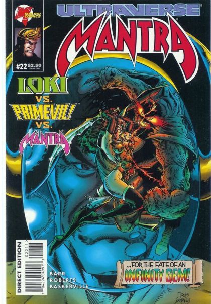 The Loki Connection - Loki! Marvel's God of Evil - Loki - covets the Mind Gem, the second of the Infinity Gems catapulted into the Ultraverse! To do his bidding, Loki sends Primevil after the gem, but when Mantra interferes, the result is the strangest love story the Ultraverse has ever seen! Cover by Dave Roberts & Stephen Bakserville.