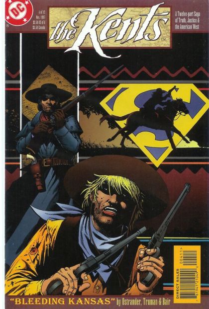 "Bleeding Kansas, Part 4." Teamed up with outlaws who are against freeing the slaves, Jebediah shoots Nathaniel during an argument over a black family. Script by John Ostrander, pencils by Timothy Truman, inks by Michael Bair. Cover price $2.50.