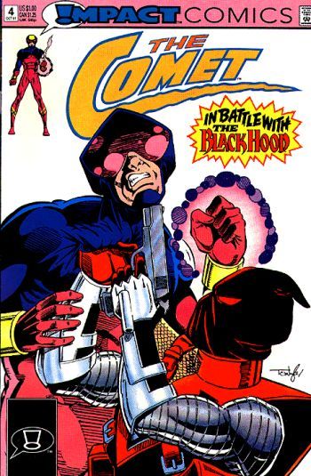 Tracking the assailant who put his brother in the hospital, the Comet comes face-to-hood with !mpact Comics' newest masked man, the mysterious Black Hood.