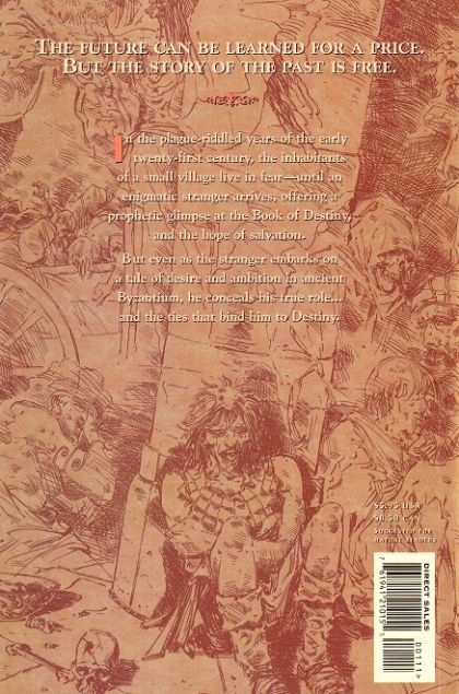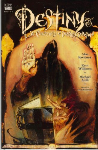 Beginning a 3-issue miniseries delving into the past and future of Destiny of the Endless, with painted covers and framing sequences by Kent Williams. In the year 2009, a small town holds out against a devastating pandemic, its remaining inhabitants desperately hoping to survive the next outbreak of plague. Then a mysterious stranger arrives from nowhere, selling a page that he claims is not only taken from the Book of Destiny, but also foretells the four great plagues of humankind, including where the current one will strike next. To convince them of its worth, he offers to read from the page, revealing Destiny's role--as well as his own--in the previous three plagues, starting with the epidemic that struck the Byzantine empire. Written by Alisa Kwitney. Art by Kent Williams and Michael Zulli. Painted cover by Kent Williams. Mature Readers. FC, 48 pg. Prestige Format. Cover price $5.95.