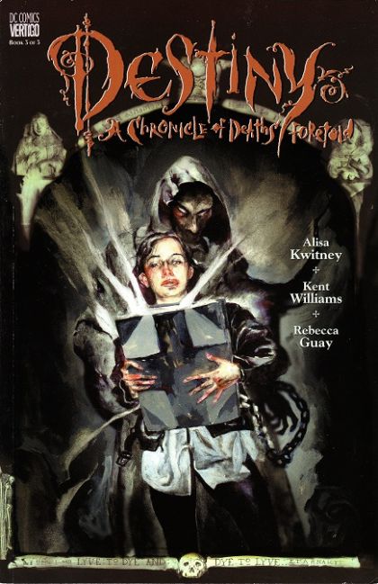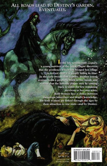 The enigmatic John Ryder reads the third and final tale from his prophetic book, which contains a page stolen from Destiny's own ancient tome of knowledge. This final story recounts the fate of a young woman living in a small English village in the 17th century, during the time of the Great Plague. Yet past and present intersect in unexpected ways as ancient predictions are fulfilled and Ryder finds himself at a crossroads, forced to choose between love...and Destiny. Written by Alisa Kwitney. Painted art by Kent Williams and Rebecca Guay. Painted cover by Kent Williams. Mature Readers. FC, 48 pg. Prestige Format. Cover price $5.95.