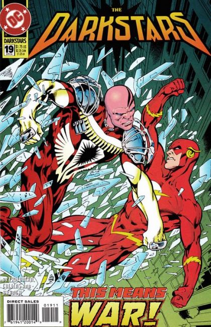 Flash is duped by Merayn into taking on Colos and his deputies in "Eve of Destruction Part Two: The Weapon." The Combine appearance. Continued from the previous issue, and continues next issue. Script by Michael Jan Friedman. Art by Mike Collins & Ken Branch. Cover by Alan Davis & Mark Farmer. Cover price $1.75.