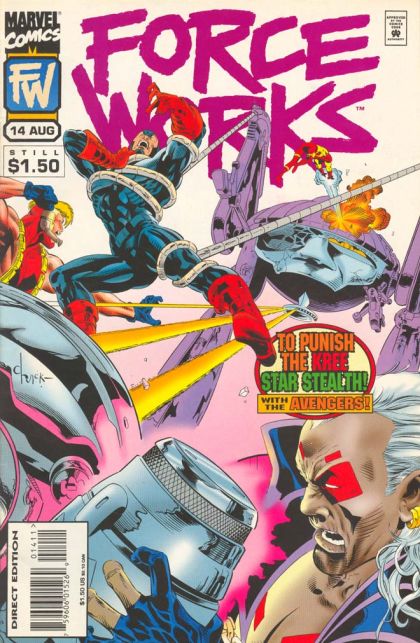 "The Fires of Sunrise" Part 2 of 2. Guest-starring the Avengers. Script by Dan Abnett and Andy Lanning. Pencils by Dave Ross. Inks by Mark McKenna. Cover by Dave Ross and Mark McKenna. Force Works and the Avengers open up two fronts to battle the evil menace of the Kree Starstealth! Shell-head, Crystal, Pietro, Hercules, and the agent attack the heavily armed Kree prisoners in a nearby rail yard! While Century, Goliath, Spider-Woman, and both team leaders teleport to the Skrull Tribunal Ship orbiting high overhead! The fight on the railhead is going great (for the heroes) until the surviving Kree renegades are suddenly transported to the tribunal ship with their weapons! How did that happen?! Mysteriously the devious Recorder has taken over the spaceship! And now the Starstealth prepare to execute the Skrulls, Avengers, and Force Works! What a turn of events! However the awesome power of the Scarlet Witch is still in play! Can Wanda save her new team…and her old one? A terrific two-part story! Force Works Lineup: Iron Man, Century, Scarlet Witch, Spider-Woman, and the U.S. Agent. Avengers Lineup: Black Widow, Crystal, Goliath, Hercules, and Quicksilver. 32 pages. Cover price $1.50.
