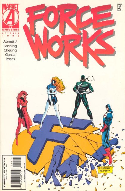 "Traitor's Gate" Script by Dan Abnett and Andy Lanning. Pencils by Jim Cheung. Inks by Rey Garcia. Cover by Jim Cheung and Rey Garcia. The Scarlet Witch and U.S. Agent return to FW's headquarters after attending the reunion at Avengers Mansion. They had fun reminiscing with old friends, but now it's time to focus on their present team! With Century's departure, the Force Works' roster is down to five: Wanda, Spider-Woman, Shell-head, the agent, and Moonraker. Hold on, who is Moonraker? Where did he come from and why is he so affectionate towards Julia? The Scarlet Witch and the agent act like they've known him for a long time, but surprisingly Spider-Woman's daughter has never seen him! Is something rotten in the state of Force Works? First appearance of Moonraker. Cameo appearances by Century and the Broker. Force Works Lineup: Iron Man, Moonraker, Scarlet Witch, Spider-Woman, and the U.S. Agent. (Notes: The plot from the one-shot: Avengers The Crossing continues in this issue. Century appears next in the one-shot: Century Distant Sons. This issue includes a glossy (3-D) pull out poster of "Spider-Man's secret villains" sponsored by Fruit Roll-Ups.) 32 pages. Cover price $1.50.