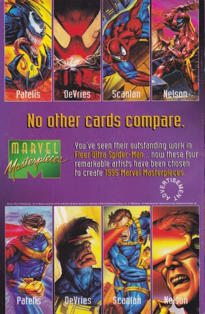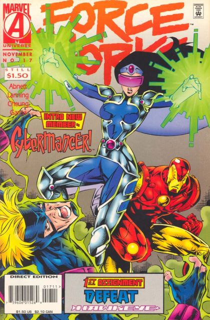 "Cybermancy!" Guest-starring Hawkeye. Script by Dan Abnett and Andy Lanning. Pencils by Jim Cheung. Inks by Rey Garcia. Cover by Jim Cheung and Rey Garcia. Force Works is coming apart at the seams! And in large part due to the erratic behavior of the team's founder: Iron Man! Against the wishes of the Scarlet Witch, Shell-head appoints a new member to the team! Cybermancer! And then the golden avenger accuses Hawkeye (in absentia) of murdering both Marilla and Rita DeMara during the Avengers' reunion in Manhattan several days ago! What?! That can't be right! Nevertheless Force Works sends Cybermancer and the U.S. Agent to round up the ace archer! But Iron Man interferes in that operation too! Is it time to give Shell-head the boot? Story continues in War Machine 20 and Iron Man 322. Second appearance of Cybermancer (aka Suzy Endo). Force Works Lineup: Cybermancer, Iron Man, Moonraker, Scarlet Witch, Spider-Woman, and the U.S. Agent. (Note: The plots from Iron Man 321 and Avengers 392 continue in this issue.) 32 pages. Cover price $1.50.