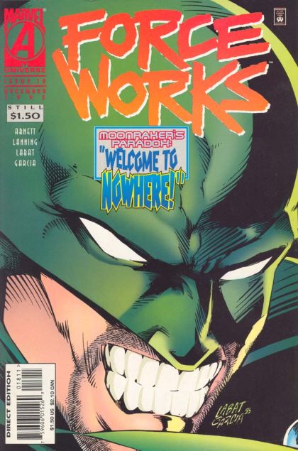 "Welcome to Nowhere!" Script by Dan Abnett and Andy Lanning. Pencils by Yancey Labat. Inks by Rey Garcia. Cover by Yancey Labat and Rey Garcia. After receiving a chaos alert at the end of last issue, Force Works zooms to Southeast Asia to investigate! Apparently the entire country of Vietnam has vanished! And nobody except Spider-Woman's daughter remembers it ever existing! Once Moonraker, Spider-Woman, Fisher, and the Scarlet Witch arrive at Agaphaur (the former temple of the Priests of Pama); Apocryphus and his allies attack! Wasn't Apocryphus one of the Anachronauts from Avengers Annual 21? That may explain who the mastermind behind the mayhem is! In the meantime though, Force Works must fight to stay alive...in the land that time forgot! Cameo appearances by the Black Widow, Hawkeye, War Machine, and the U.S. Agent. Force Works Lineup: Cybermancer, Moonraker, Scarlet Witch, and Spider-Woman. (Note: Elements of the story continue in War Machine 21.) 32 pages. Cover price $1.50.