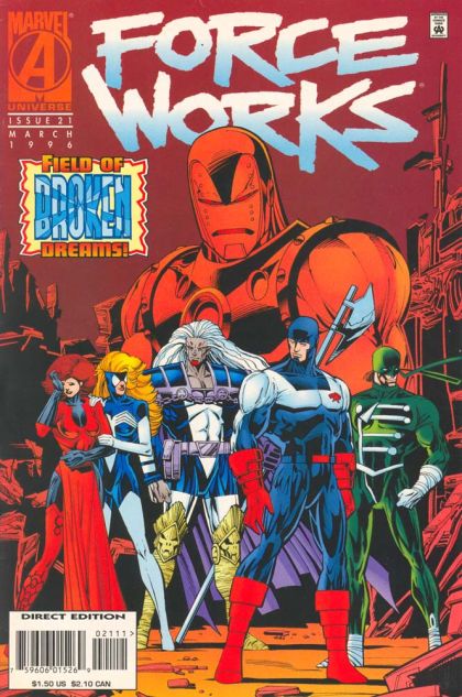 "Afterimage" Part 1 of 2. Script by Dan Abnett and Andy Lanning. Pencils by Yancey Labat and Andrew Wildman. Inks by Rey Garcia, Sandu Florea, and Sergio Cariello. Cover by Yancey Labat. The Crossing is over, but Force Works has suffered irreparable damage. The team's founder is dead and FW's headquarters lies in near ruins. Wanda, Julia, Century, and the agent try to pick up the pieces and move forward. And the first order of business is figuring out what to do with Cybermancer! She's actually Suzy Endo from 15 years in the future! And the second item on the agenda is deactivating Kang's leftover time-gate! But what if a couple of Cybermancer's colleagues (from the future) attempted to rescue her through the time-gate? And what if they looked a lot like Ultron and Wonder Man? Uh-oh! In the blink of an eye, the adamantium robot and Simon Williams appear from the future and attack! Will Force Works end up in ruins...just like their building? Force Works Lineup: Scarlet Witch, Spider-Woman, Century, and the U.S. Agent. 32 pages. Cover price $1.50.