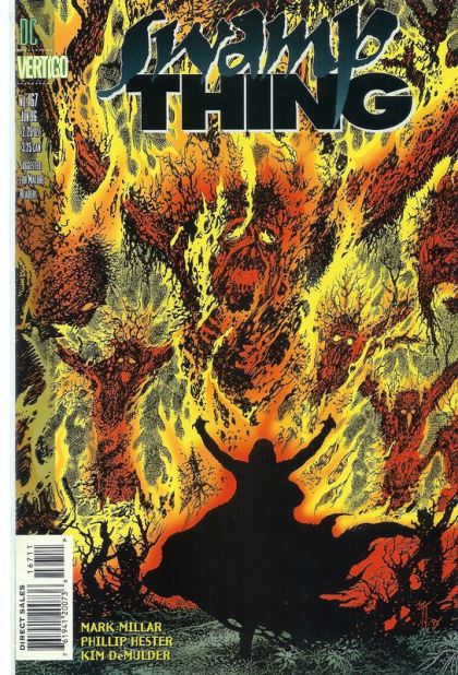 'Trial by Fire,' part 2 of 6. Mark Millar's climactic Swamp Thing storyline continues: As Jason Woodrue seeks help in stopping Swamp Thing's plans to destroy humankind, Timothy Raven prepares to invoke the spirit of Anton Arcane; Lady Jane and the Parliament of Trees face possibly their last stand against The Word; and Abby and Chester make desperate plans of their own. Written by Mark Millar, with art by Phil Hester and Kim DeMulder. Cover by John Totleben. Suggested for Mature Readers. FC, 32pg, Mando Format Cover price $1.95.
