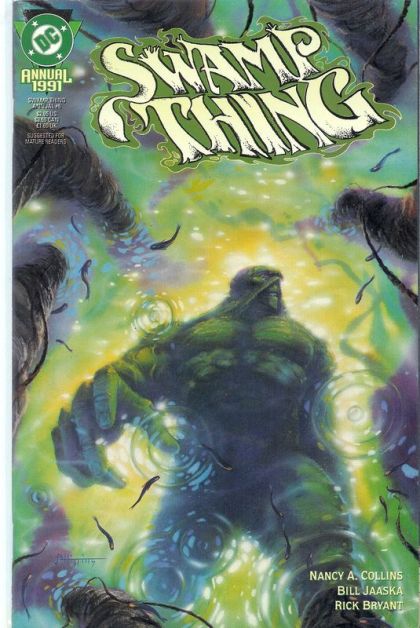 An exciting new creative team arrives to usher Swamp Thing into the '90s. Swamp Thing, Abby and Tefe return to the Louisiana bayou to reacquaint themselves with friends...and find that a bizarre creature composed of the bodies of four cruelly murdered people stalks Houma. Written by award-winning horror novelist Nancy A. Collins, with art by Bill Jaaska and Rick Bryant. Painted cover by John Higgins. 68 pages. Suggested for Mature Readers. New Format. Cover price $2.95.