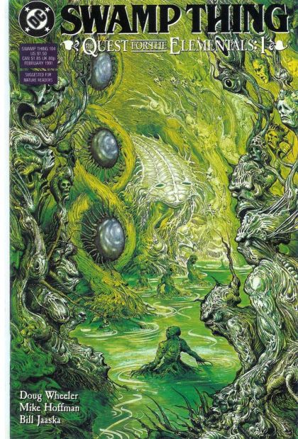 Part 1 of the 6-part 'The Quest for the Elementals': Fleeing to the Parliament of Trees in Brazil, Swamp Thing and Abby learn all about the mysterious forces of the Grey pursuing their daughter...and the Green Elementals missing from the Parliament. Beginning with this issue, Swamp Thing fights to restore the Parliament to full strength before the Grey destroys it forever! Also, some startling facts about Swamp Thing's origin are revealed. Written by Doug Wheeler, with art by Mike Hoffman and Bill Jaaska. Painted cover by Ian Miller. Suggested for Mature Readers. New Format. Cover price $1.50.