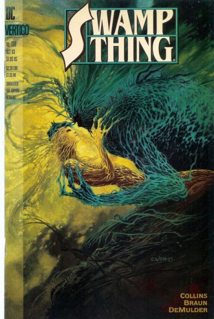 As Swamp Thing and Lady Jane commune in the Green, Arcane strikes against Abby. Plus, a bizarre transformation takes place for Dr. Polygon. This issue lays the groundwork for a story that establishes a new direction for Swamp Thing. Written by Nancy A. Collins, with art by Russell Braun and Kim DeMulder. Painted cover by Charles Vess. Suggested for Mature Readers. New Format. Cover price $1.95.