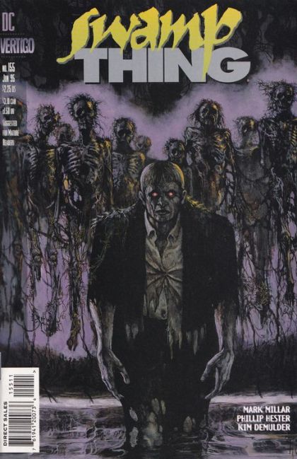 'River Run' continues: Swamp Thing's odyssey through parallel worlds leads him to a dark bayou where an aged, semiretired super-hero must defeat Solomon Grundy and uncover a terrible secret. Written by Mark Millar, with art by Phil Hester and Kim DeMulder. Painted cover by John Totleben. Suggested for Mature Readers. Mando Format. Cover price $2.25.