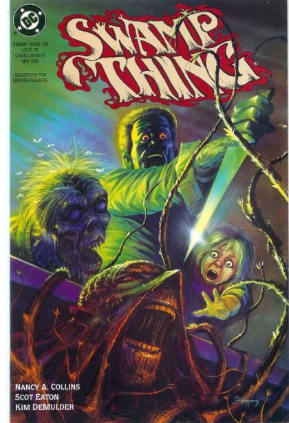 The twisted kidnapper, the Bad Man, plays out a bizarre family drama with the captive Tefe. Both Swamp Thing and the monster Les Perdu are on the trail...along with a mysterious ally from the Parliament of Trees. Written by Nancy A. Collins, with art by Scot Eaton and Kim DeMulder. Painted cover by John Higgins. Suggested for Mature Readers. New Format. Cover price $1.75.