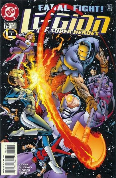 "The Fatal Five!" The Fatal Five attacks! And in the looming shadow of the total destruction of the universe, the deadliest villains in the cosmos set out to crush the Legion utterly...leaving only one hero standing. Written by Tom Peyer and Tom McCraw, with art by Lee Moder and Ron Boyd. Cover by Alan Davis and Mark Farmer. Cover price $2.25.