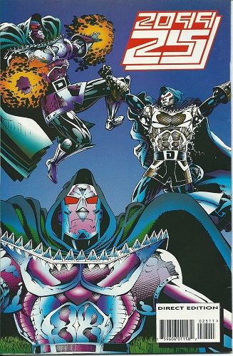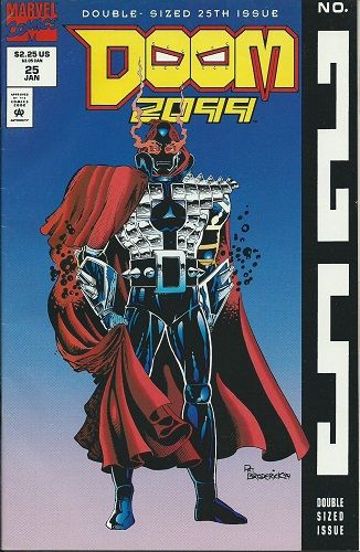 Newsstand edition (not silver embossed). Cover art by Pat Broderick. Fables of the Deconstruction, script by John Francis Moore (Story) and Warren Ellis (Dialogue), pencils by Pat Broderick, inks by John Nyberg; Doom from present day time travels to do battle with the Fake Doom of 2099; Doom gets new armor. Seeing Red, script by Pat Mills and Tom Skinner, pencils by Luke Ross, inks by Keith Williams. Reflections of a Falling Star starring Feng Huang, script by Mary Jo Duffy, art by Leo Duranona. Doom 2099 back cover art by Pat Broderick. 52 pgs. $2.25. Cover price $2.25.